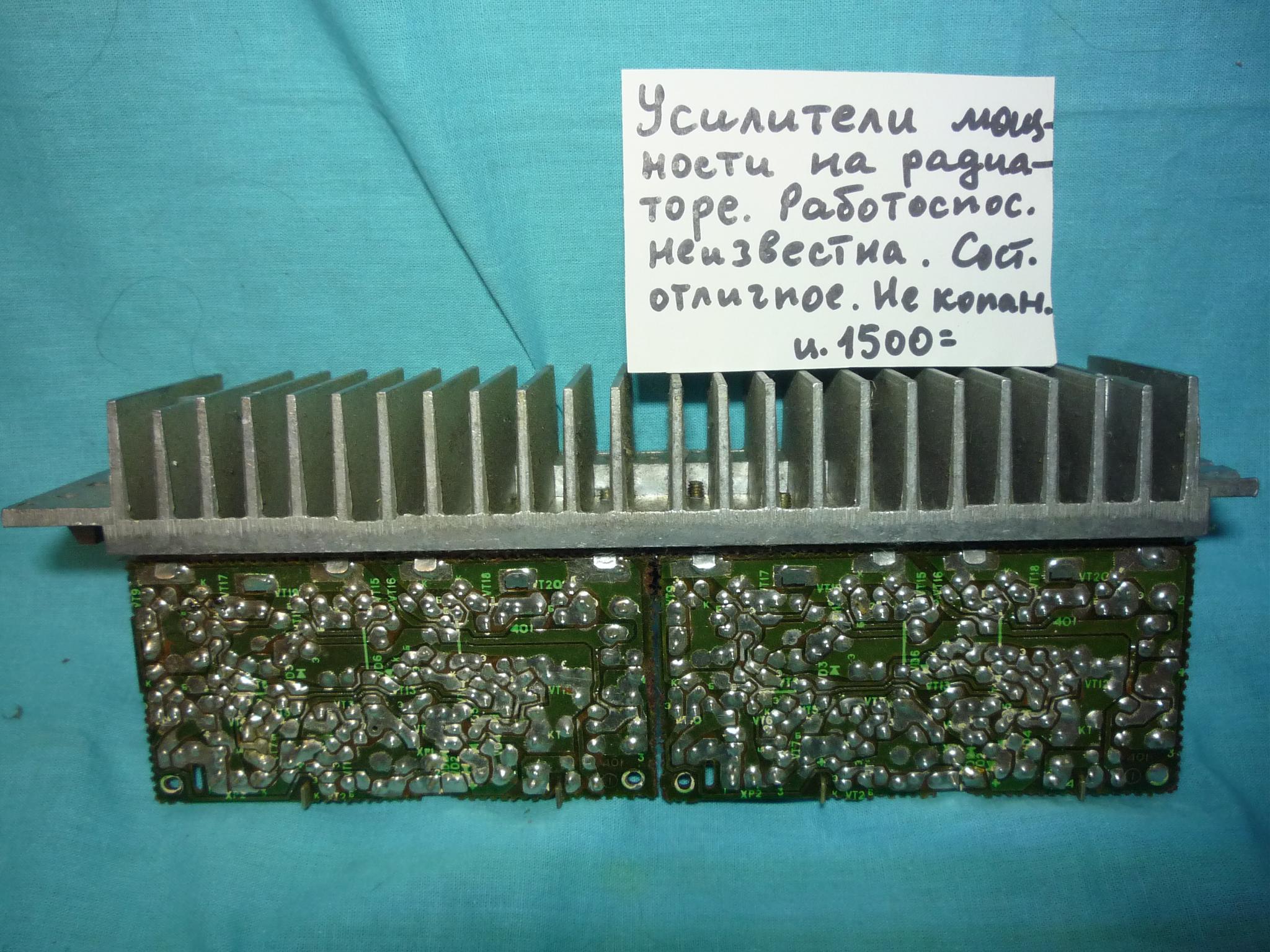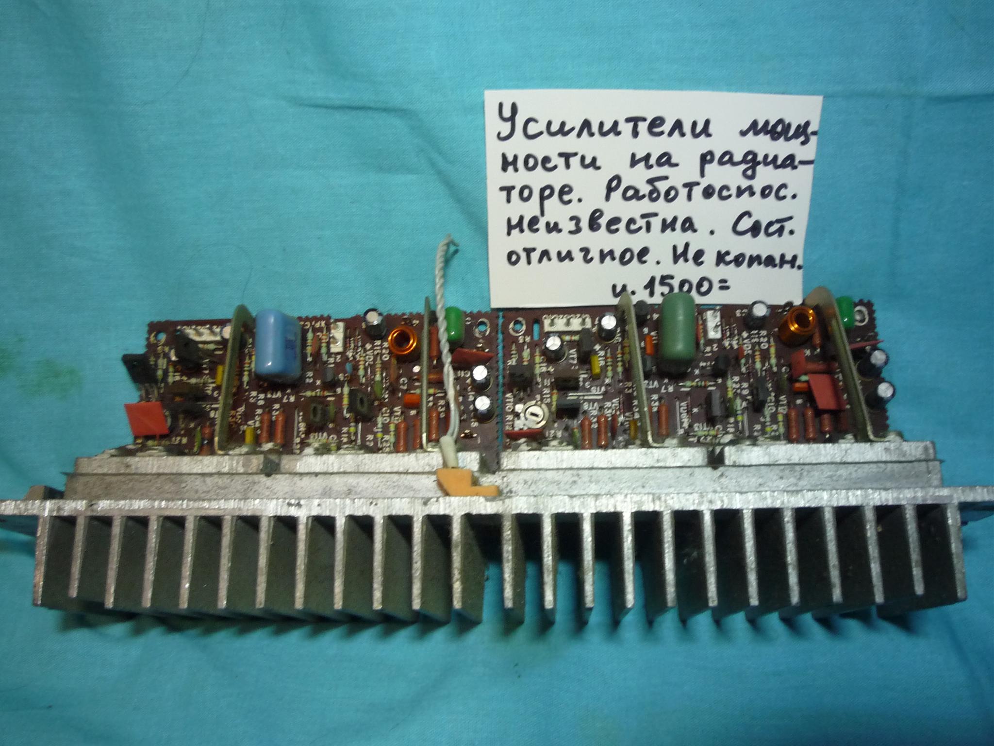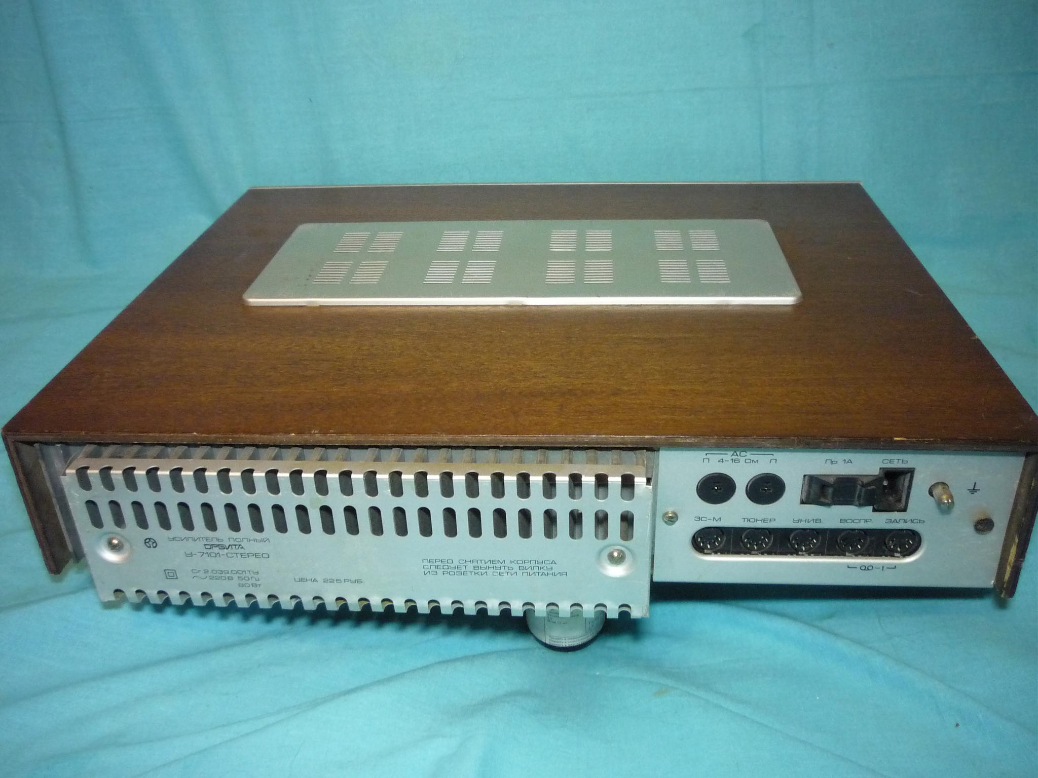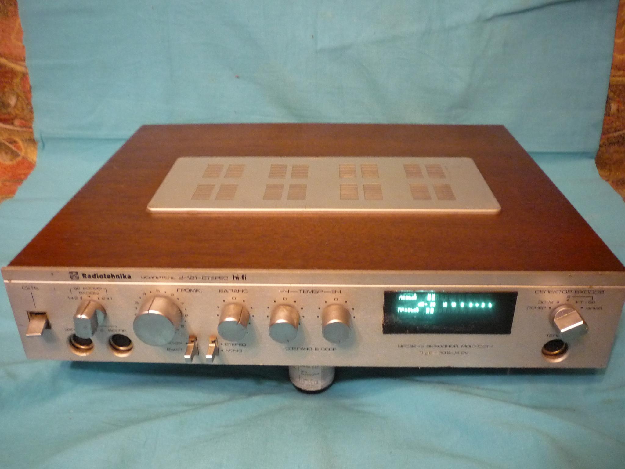 Усилитель времен СССР "Радиотехника-У101" рабочий с хорошей косметикой. Единственный недостаток- при положении регулятора громкости на 40% срабатывает блок защиты. Высохли армянские конденсаторы в блоке защиты.