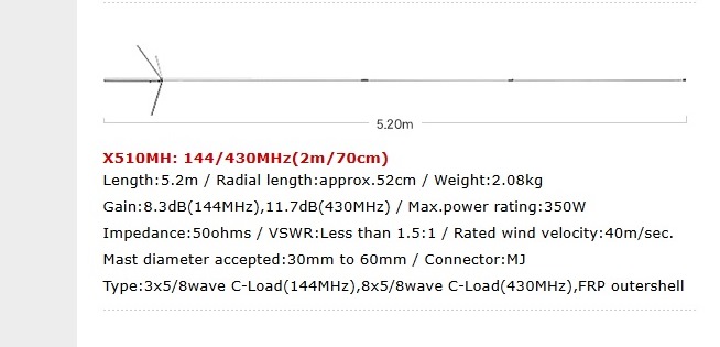 Антенна имеет размеры в высоту - 5, 2 метра, КСВ - не более 1. 2, усиление 8. 3 дБ на 144 МГц и 11. 7 дБ на 430 МГц, сопротивление 50 Ом Разъем UHF (PL-259)