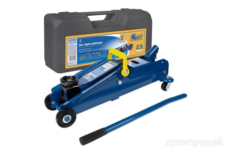 Подкатной гидравлический домкрат KRAFT 2. 5 т, кейс KT 820003 предназначен для плавного поднятия автотранспорта на высоту до 385 мм.