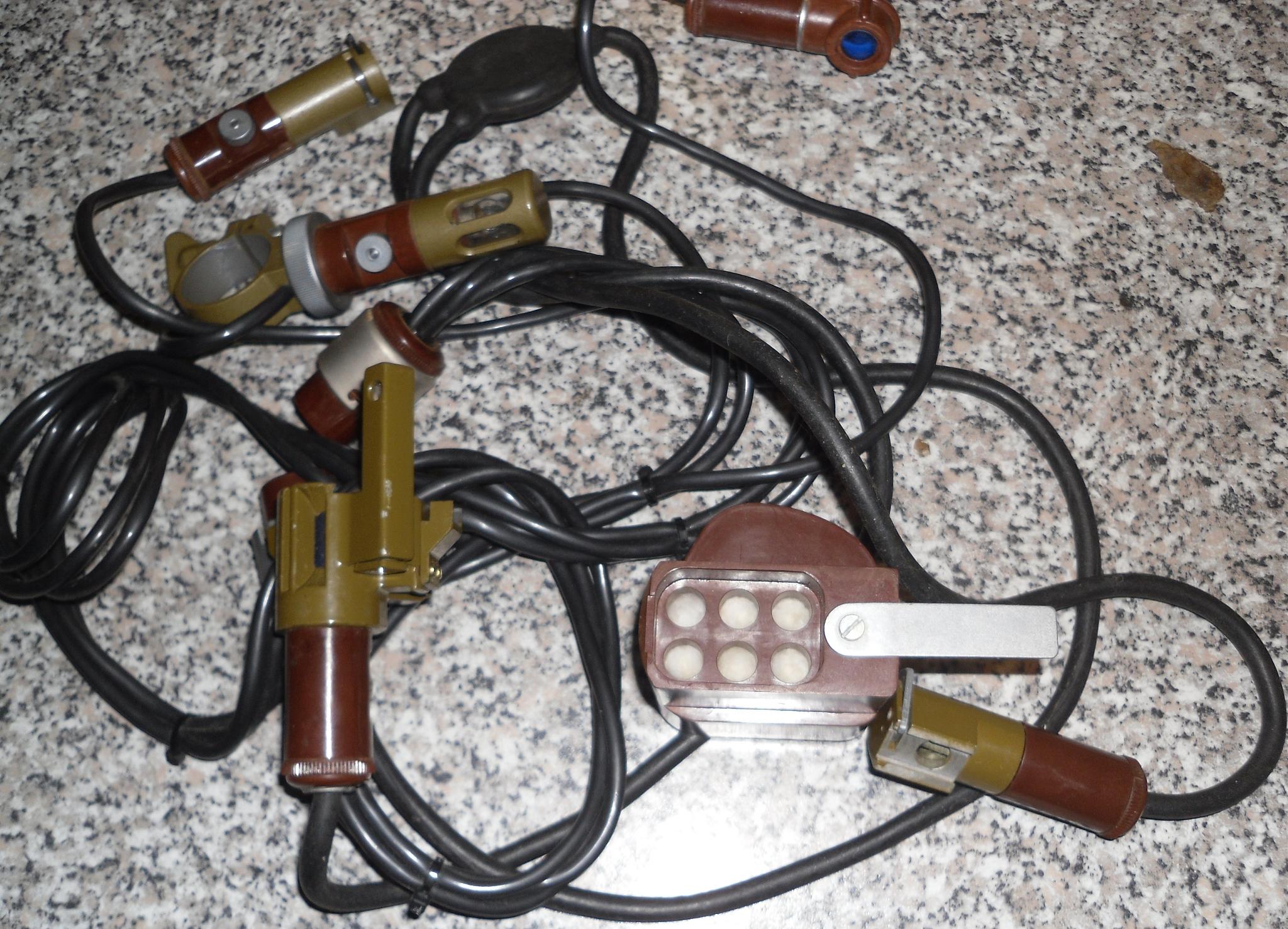 На эксперименты или в коллекцию военная, армейская герметизированная из СССР осветительная сигналка и с фильтрами, оптикой мягкими резиновыми проводами с разъемами с регулируемыми световыми потоками заслонками и установленными низковольтными эл. лампочками на 2, 5в и пультом управления в металле, все новое с хранения на фото, качественные мягкие военпрома ссср провода на поделки, продам весь вместе комплект 3000руб. +почта. Торга нет.