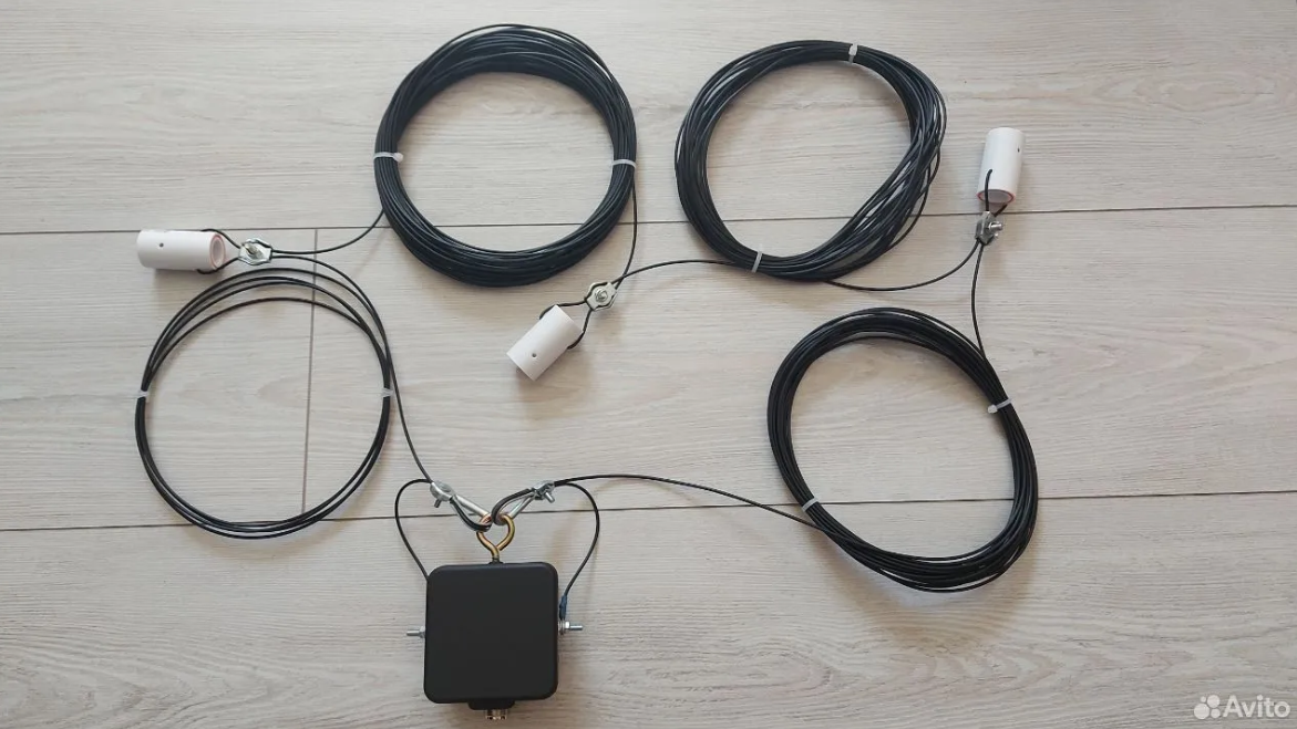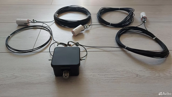 Антенна представляет собой вертикально ориентированную петлю (Delta Loop) с точкой запитки 50 Ом, к которой коаксиальный кабель подключается напрямую — без балуна.