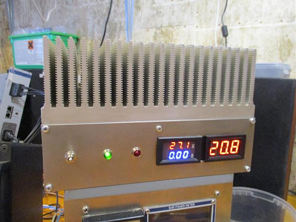 безвентиляторный ум на мощном радиаторе. одно питание 27 вольт выходная мощность 700-800 ватт при входной 10 ватт. при таком заниженном питании не требует защит по ксв и фнч. imd -40дб. радиатор фирмы семикрон по даташиту с пассивный рассеиванием мощности 1 квт. вес 6. 5 кг транзистор MRFX1K80N 1. 8квт припаян к медной пластине толщиной 1 см весом 1 кг. стоит защита от перегрева на 50 градусов. цифровой датчик температуры, цифровой вольт амперметр. перегреть ум не реально. продаю по причине не желания работать в эфире.