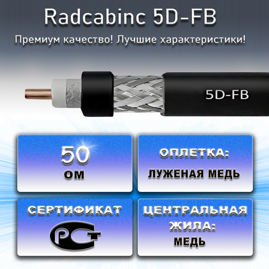 Radcabinc 5D-FB это радиочастотный коаксиальный кабель с волновым сопротивлением 50 Ом, внешним диаметром 7. 5 мм, с черным цветом изолятора. Кабель имеет медную центральную жилу и дополнительный экран из фольги, оплетка изготовлена из луженой меди, что многократно улучшает характеристики кабеля.