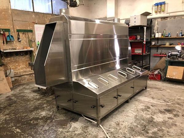 Машина оборудована ёмкостью 280 л, где происходит подогрев воды. Сюда же поступает вода из зоны ополаскивания через ячеистые фильтры. Постепенно происходит полная подмена воды (около 2 ч. ), излишки воды удаляются через перелив в систему канализации предприятия с остатками загрязнений и жира.