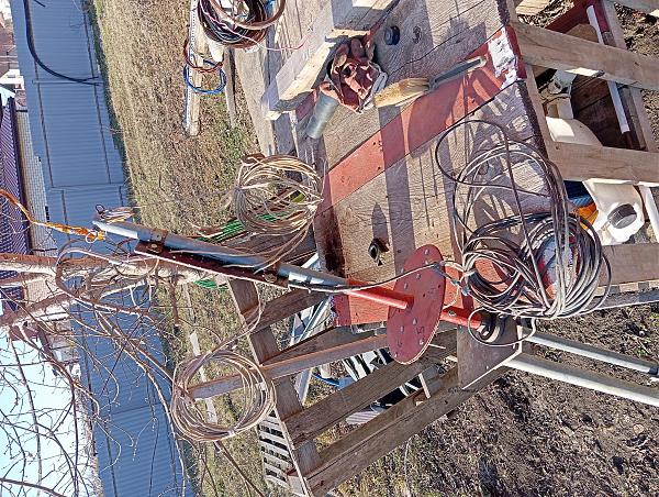 1. Мачта телескоп от р-140(?). Длина 16м. Верхнее колено снято. Была установлена антенна Спайдер. В комплекте поворотка G-250 с проводом управления. Самодельное устройство типа РМ-50. Набор стеклопластиковых распорок для антенны RR-33. Так и не была изготовлена. Оттяжки мачты были самодельные из оцинковки диаметром 4мм. В наличии тоже есть.
