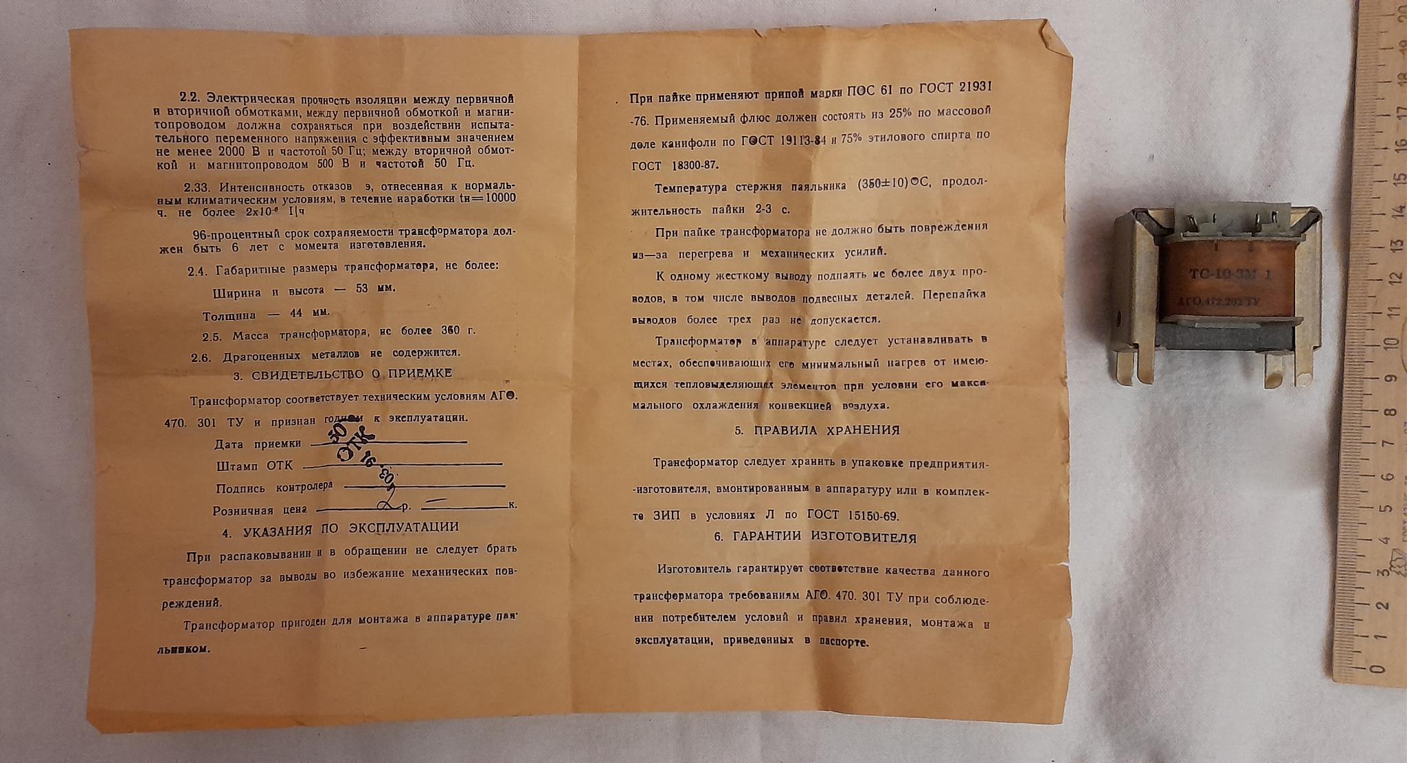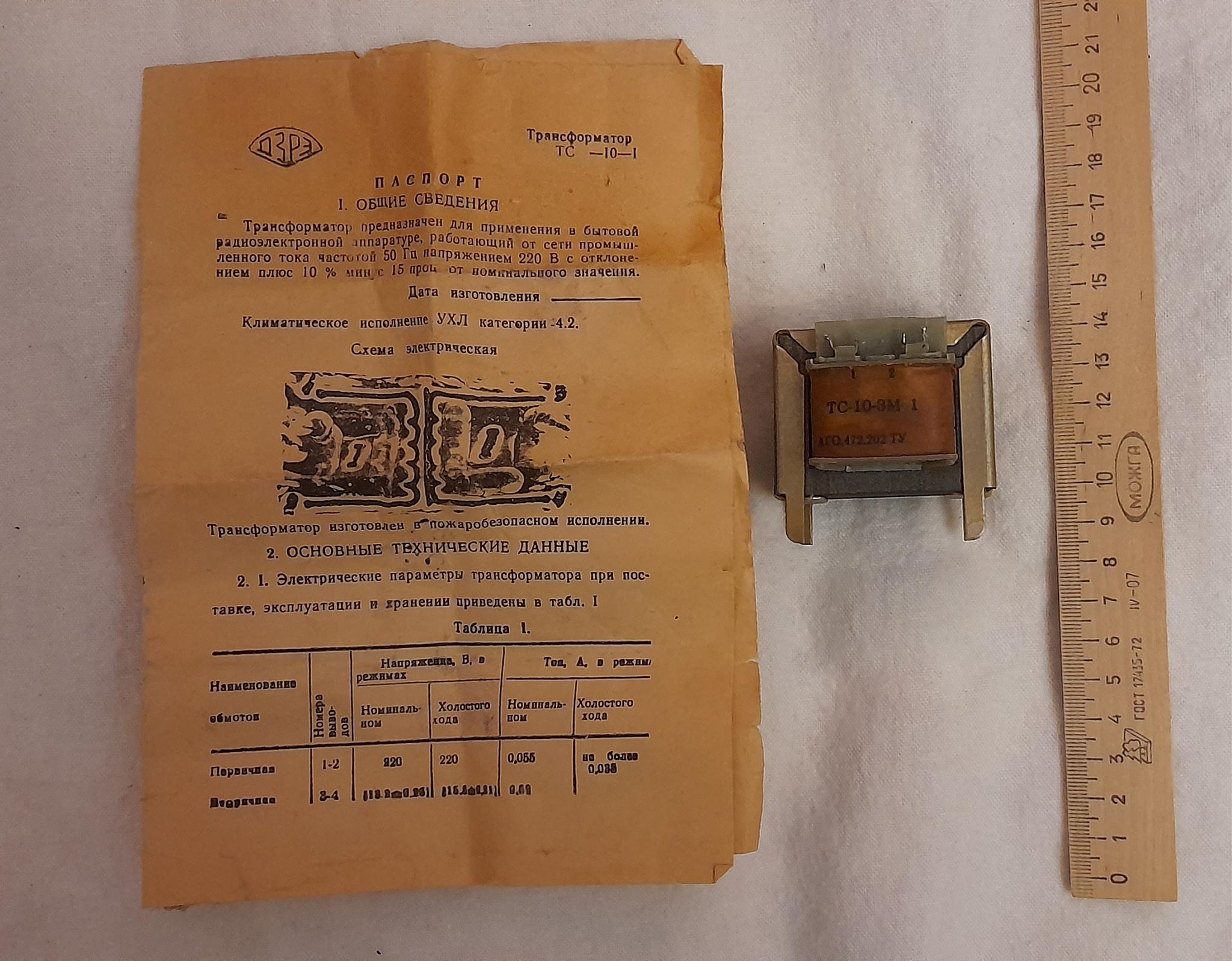 Трансформатор ТС-10-3М 1 (СССР) с паспортом