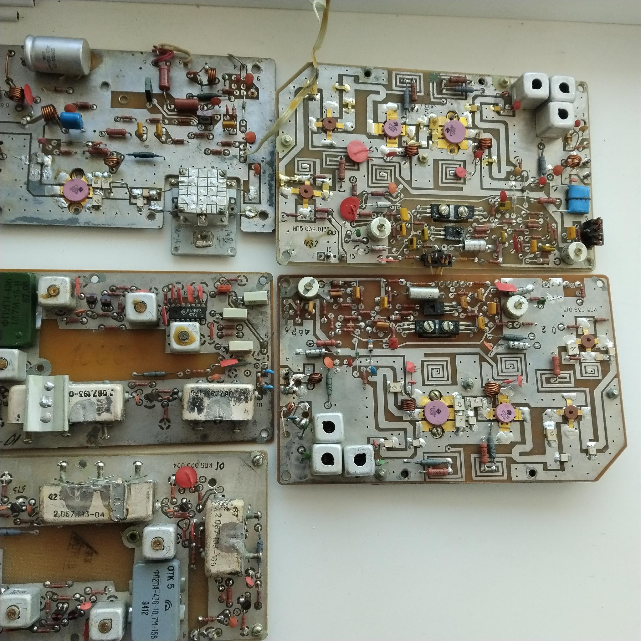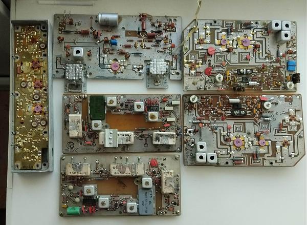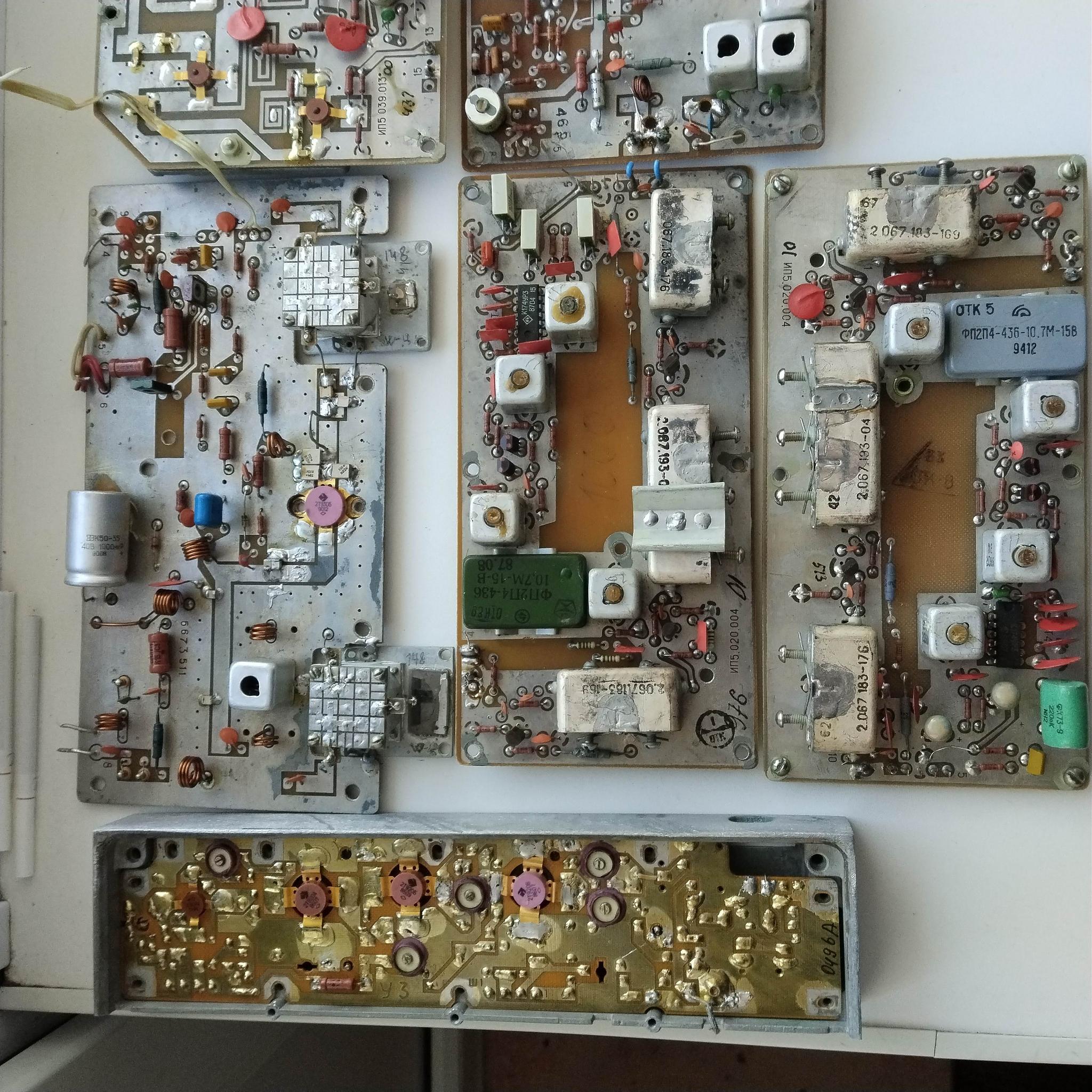 Плата усилителя мощности от р/ст ВИОЛА, две платы усилителя мощности от р/ст МАЯК, плата усилителя мощности от ВЭБР УМ 40/8-10М, две платы усилителя ПЧ от р/ст МАЯК. Все платы сняты с рабочих станций.