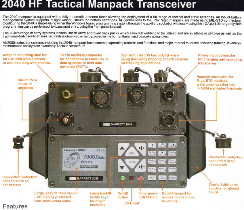 Tactical Manpack Transceiver Barrett 2040 Rx 500 кГц-30 МГц, Tx 1. 6-30 МГц; LSB, USB, CW, AM, FSK. Pвых = 30 Вт от Li-ion АКБ 10 а/ч и 125 Вт - от внешнего БП. Встроенный авт. тюнер, DSP. NB; В комплекте: - трансивер; - Li-ion АКБ 10 А/ч; - зарядка с комплектом кабелей (от 220В и от 12 В); ...