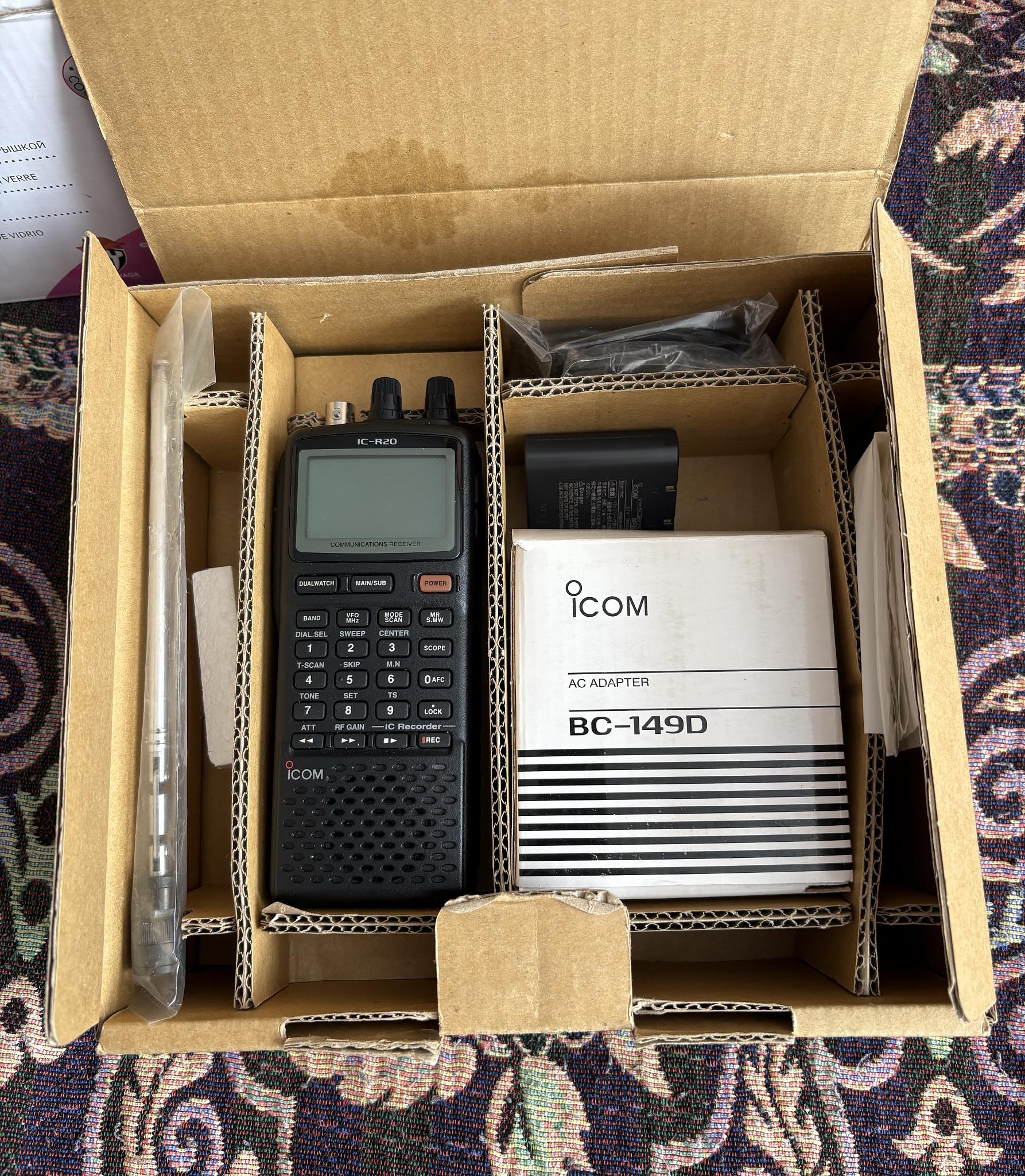 Радиоприёмник, радиосканер Icom IC-R20. Диапазон рабочих частот: 150 кГц-3304, 999 МГц. Виды модуляции: FM, AM, WFM, SSB, CW. Встроенный цифровой диктофон на 4 часа. 1250 каналов памяти. Остальные х-ки можно посмотреть в интернете. Состояние нового, почти не пользовались, пролежал в коробке. Бата ...