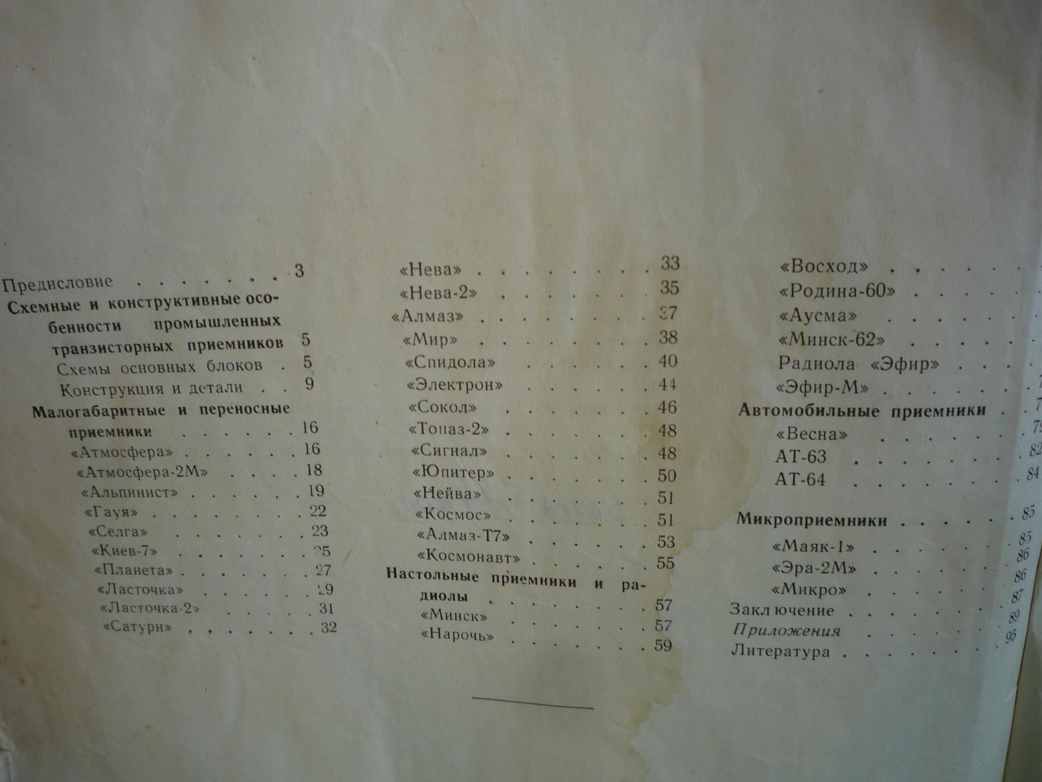 МоскваКнига "Транзисторные радиовещательные приемники" 1966г. На фото №2 список приемников размещенных в книге.