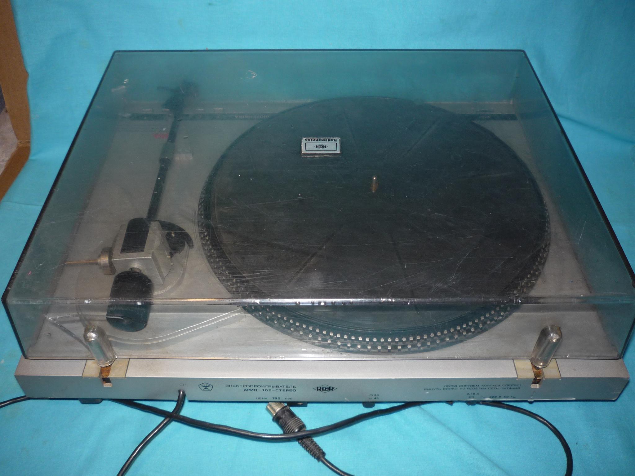 МоскваПроигрыватель грампластинок фирмы "Радиотехника" "Ария-102с" рабочий. Хорошо держит обороты. Автоматика работает. На верхней крышке слева есть около петли имеется трещина. См. фото 3 Головка стоит штатная ГЗМ-155 с небольшим пробегом..
