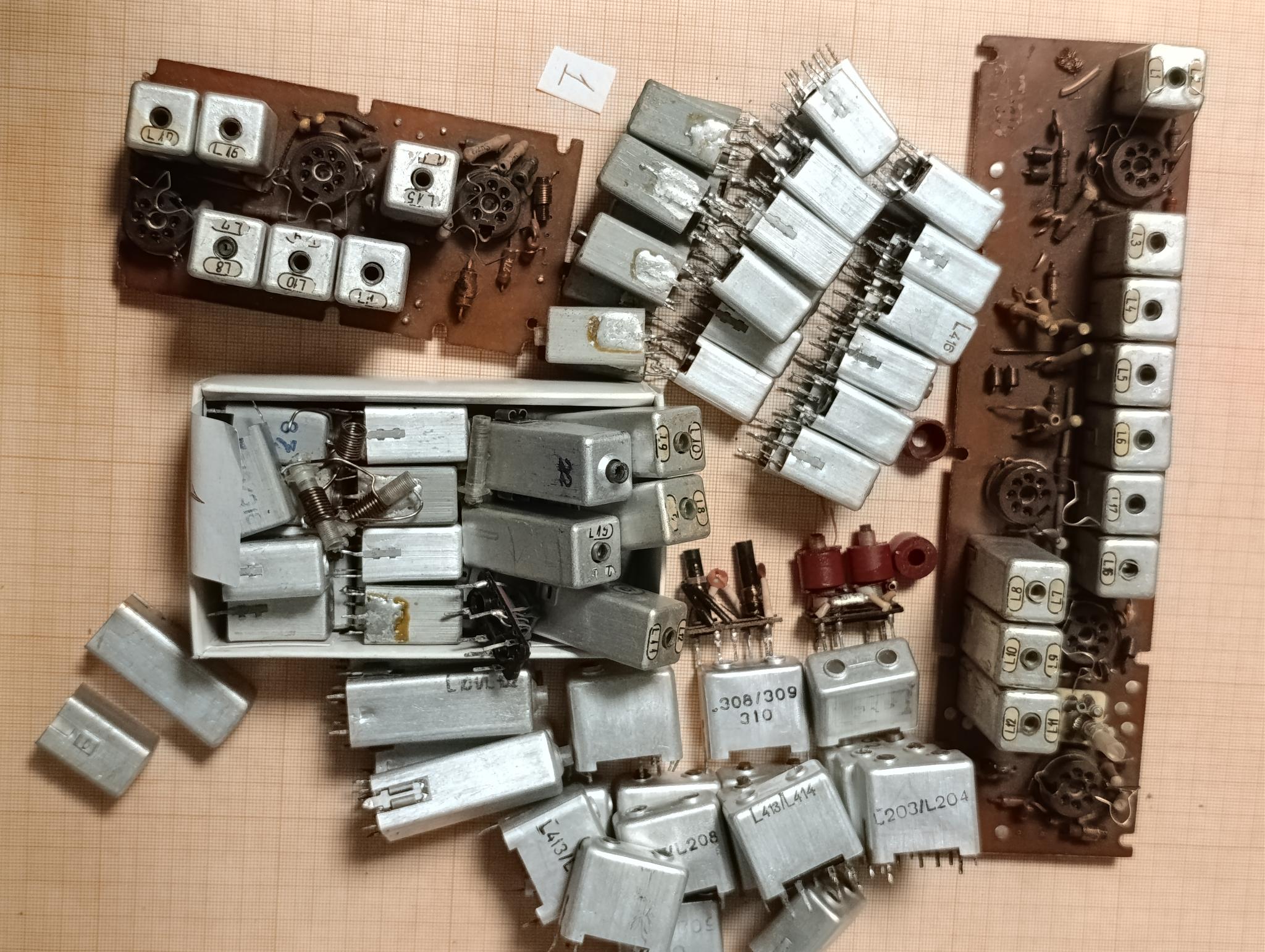 КотовоКаркасы катушек индуктивности, в том числе из ЗИПа р/ст. ЛЁН-б. Фото 2 - катушки с телевизионных приёмников без экранов - 28 шт., с круглыми экранами 6 шт., с прямоугольными 12 шт.. Фото 3 - каркасы керамические Ф21Х50 3 шт., Ф15Х44 3 шт., шестигранные Ф24Х50 1 шт., 17Х34 3 шт., 15Х42 2 шт., 6-ти гр ...