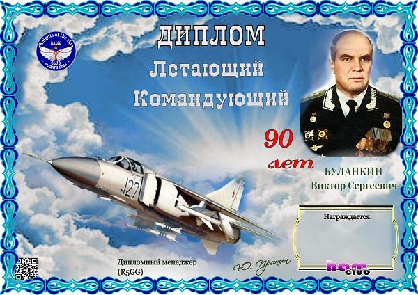 Клуб радиолюбителей-авиаторов «Рыцари неба» с 11 по 20 октября 2025 г. проводит Дни активности, посвящённые 90-летию Заслуженного военного лётчика СССР, генерал-полковника авиации В.С.Буланкина и представляет диплом, посвящённый этому событию.
