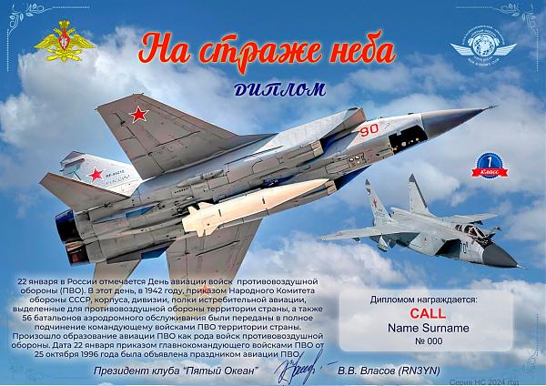 22 января 2026 года исполняется 84 года со дня образования Авиации ПВО России. В честь этого события клуб радиолюбителей-авиаторов «Пятый Океан» проводит дни активности с 17.01.2026 г. по 25.01.2026 г. Учрежден диплом «На страже неба» в новой редакции, посвященный этому событию.