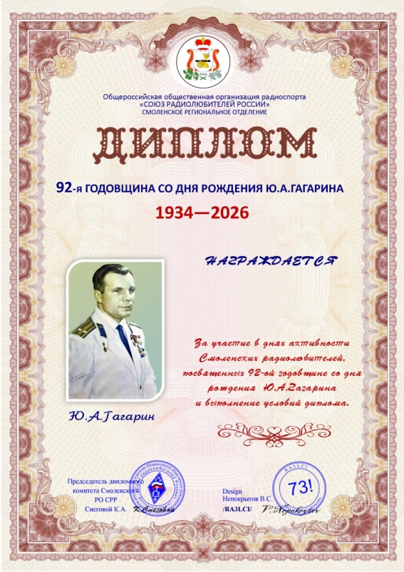 РО СРР Смоленской области проводит дни активности радиолюбителей Смоленской области с 01 по 12 марта 2026 года посвященные 92-й годовщине со дня рождения Ю.А. Гагарина.