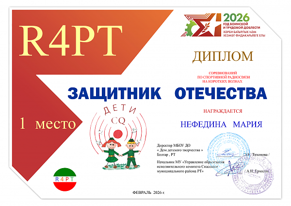 И вот наступило 23 февраля–в день ЗАЩИТНИКА ОТЕЧЕСТВА стартовали всероссийские соревнования “ ЗАЩИТНИК ОТЕЧЕСТВА “! Два часа спортивного праздника объединили более ста участников со всей страны – от Владивостока до Калининграда ! Юные и взрослые радиоспортсмены соревновались в своём операторском мастерстве , передовая друг другу условные контрольные номера . Работа в эфире требует специальной подготовки как оборудования , так и спортсменов . Среди наших лучших юных операторов для участия в этих соревнованиях была выбрана Мария Нефедина , ученица 7 класса БСОШ 1 г.Болгар , РТ .