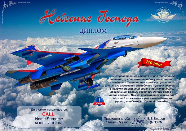 В честь этого события клуб радиолюбителей-авиаторов «Пятый Океан» проводит дни активности с 21.03.2026 г. по 29.03.2026 г. Учрежден диплом «Небесные Господа» в новой редакции, посвященный этому событию.
