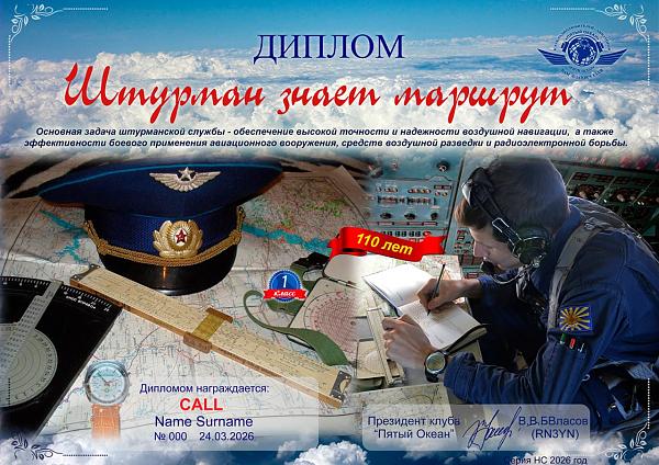 Клуб радиолюбителей-авиаторов «Пятый Океан» с 21.03.2026 г. по 29.03.2026 г. дни активности, посвященные 110 лет Штурманской службы ВВС России (основана 24 марта 1916 года).