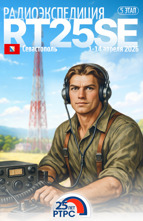 В рамках 5-го этапа радиомарафона "РТРС - 25 лет" 1-14 апреля 2026 года в эфире специальная радиостанция RT25SE из Севастополя. В команде: R7RDE, RX7R, R7RF, R7RC, R7RBE. Все диапазоны. CW, Digi, SSB. Планируется работа через любительские ИСЗ.