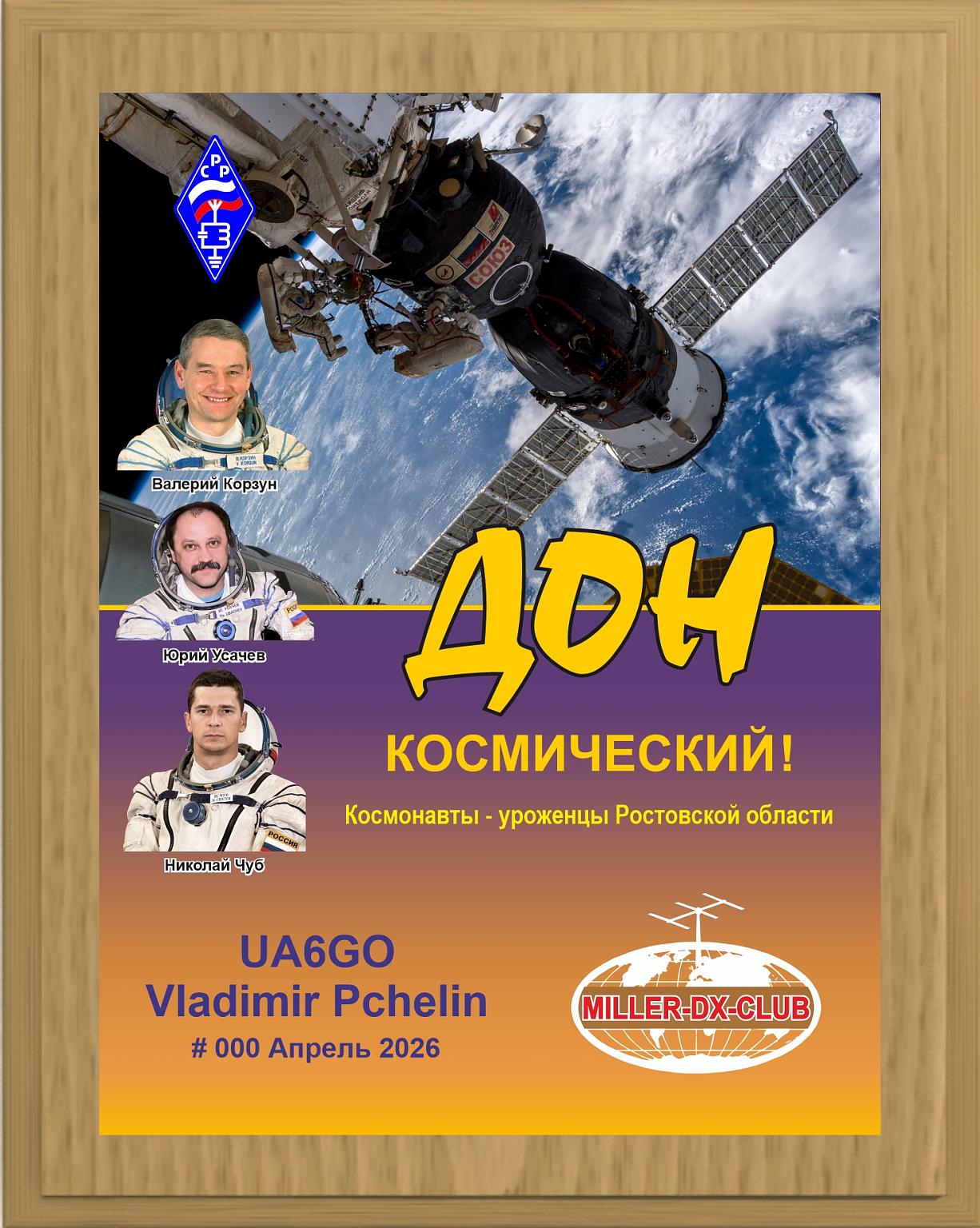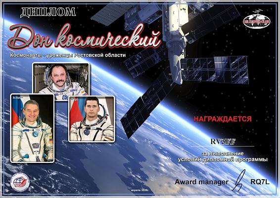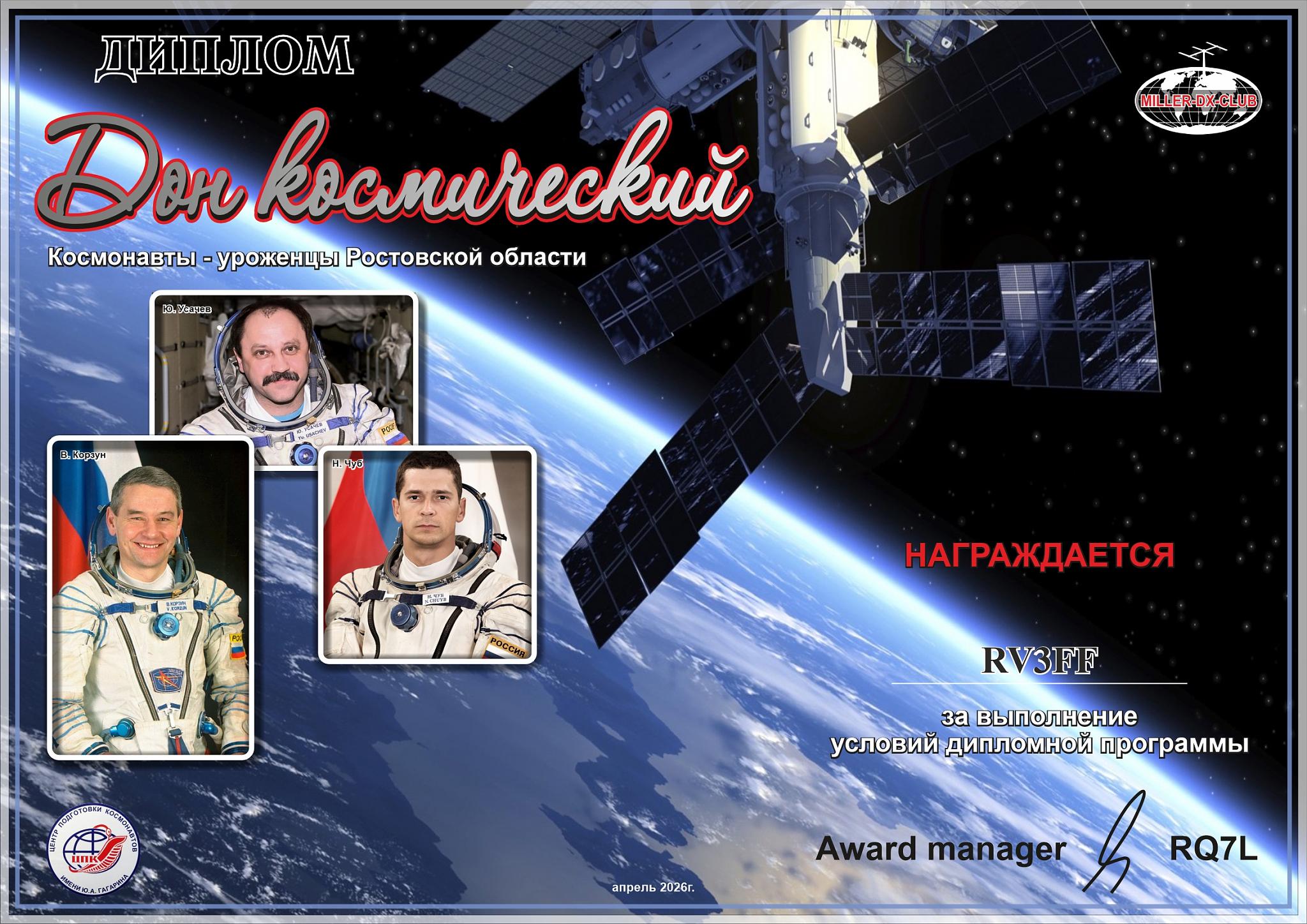 В преддверии дня космонавтики, Региональное отделения СРР по Ростовской области, международный клуб любителей дальней радиосвязи «Miller-DX-Club», совместно с порталом HAMLOG.ONLINE, восьмой год подряд проводят дипломную программу «Дон космический», посвященную космонавтам – уроженцам Ростовской области.