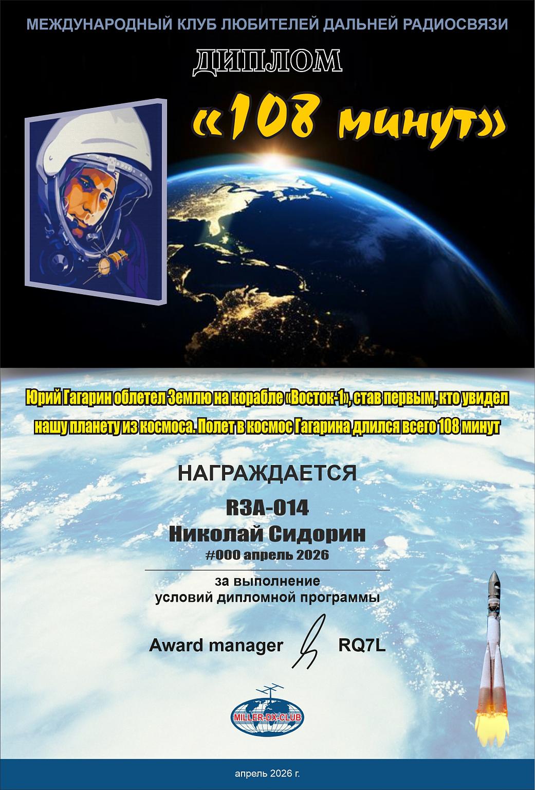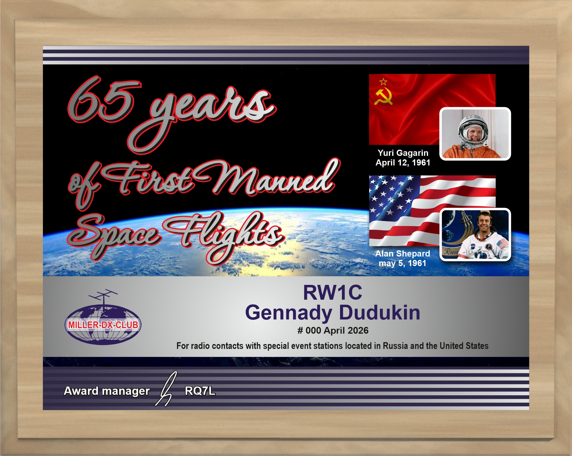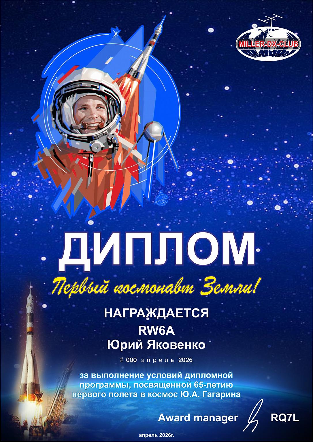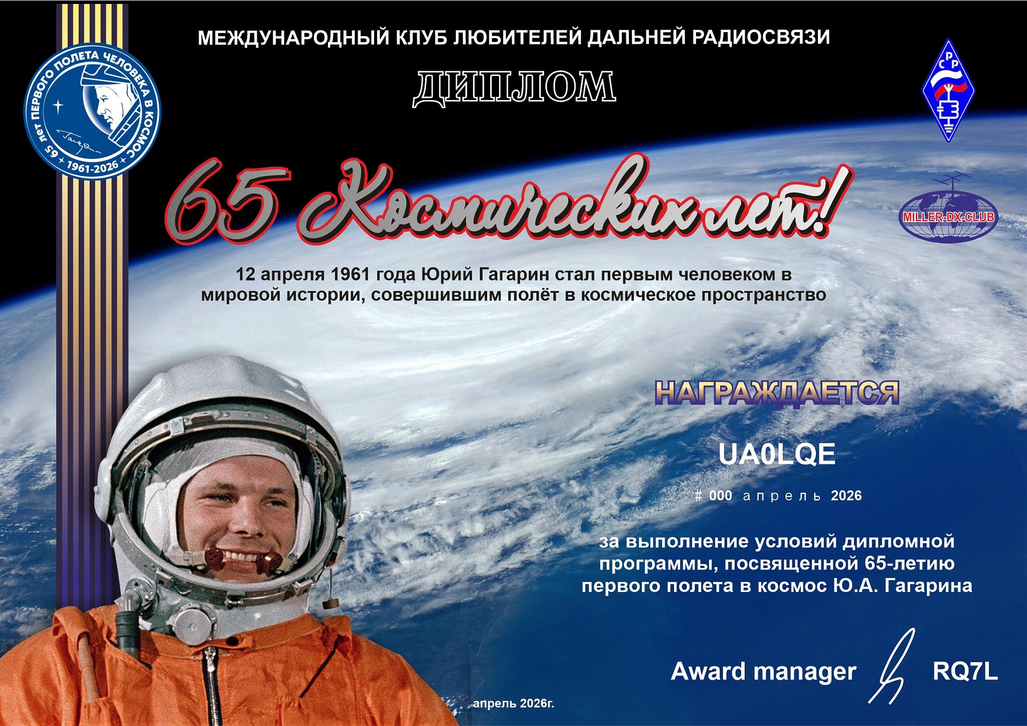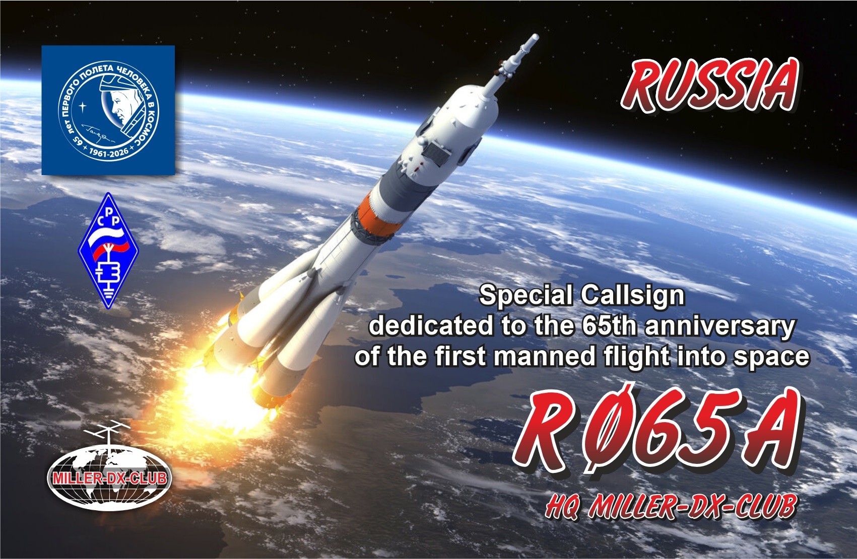 В этом году исполняется 65 – лет со дня первого полета Ю.Гагарина и астронавта из США Алана Шепарда в космос! Продолжая тему проектов «55 и 60 Космических лет!» клуб любителей дальней радиосвязи «Miller-DX-Club» при поддержке Регионального отделения СРР и Портала Hamlog.online в рамках культурно-спортивных мероприятий проводят международный радиомарафон «65 Космических лет!»