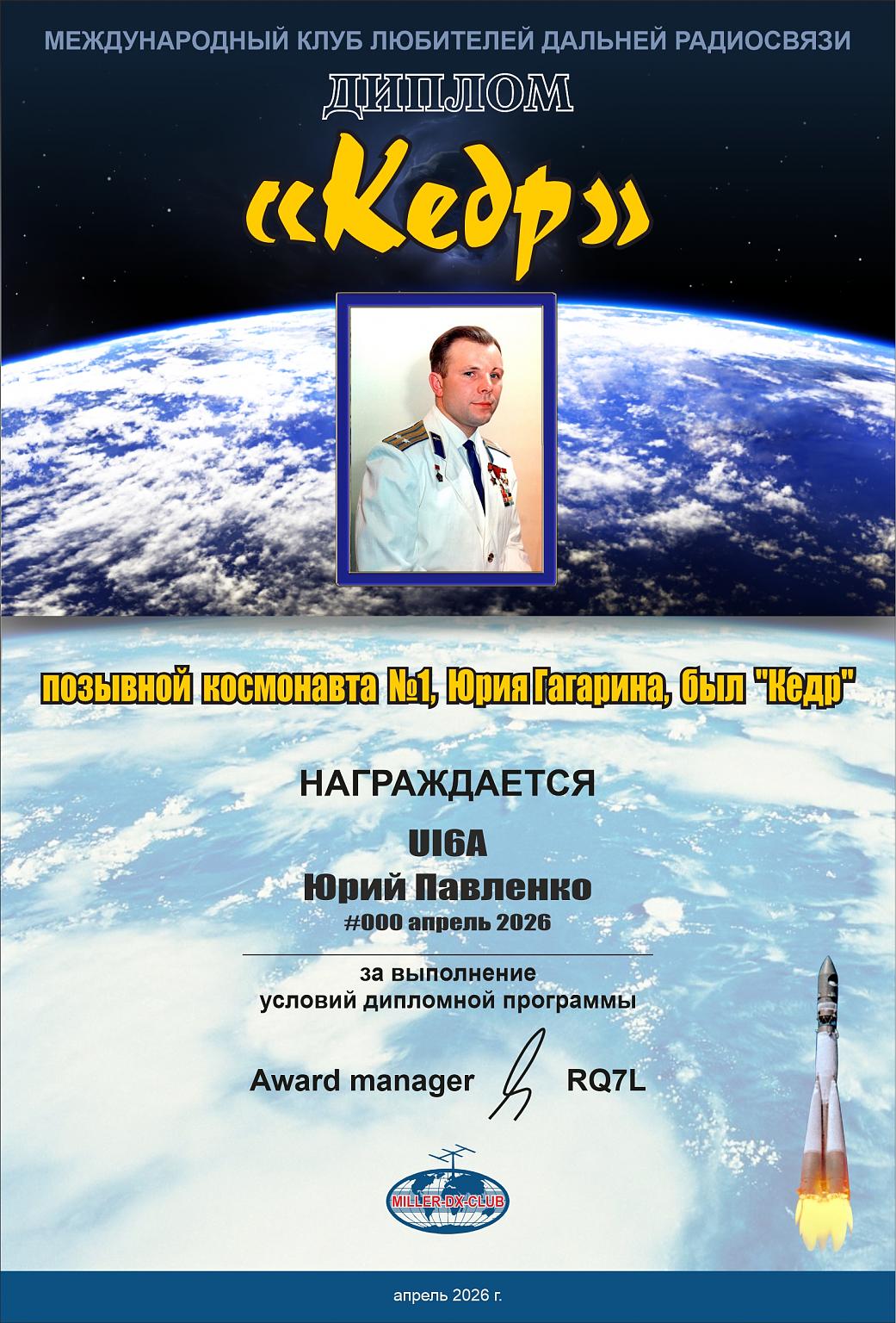 - «65 Космических лет!» 65 очков ( 65 лет со дня первого полета человека в космос ) «Кедр» 65 очков (позывной Юрия Гагарина)