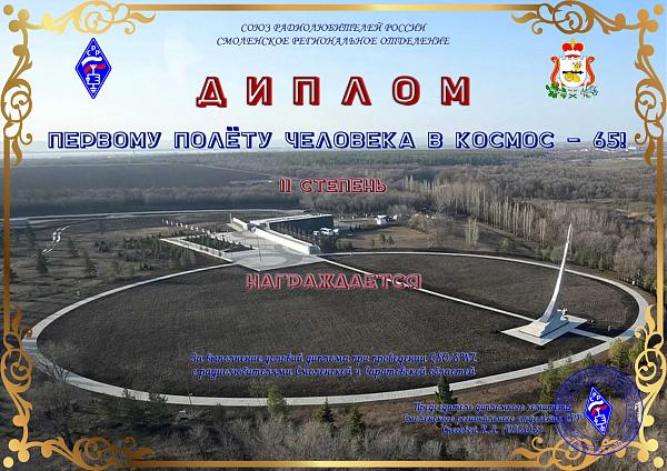 Условия выполнения диплома «Первому полёту человека в космос - 65! II степень»