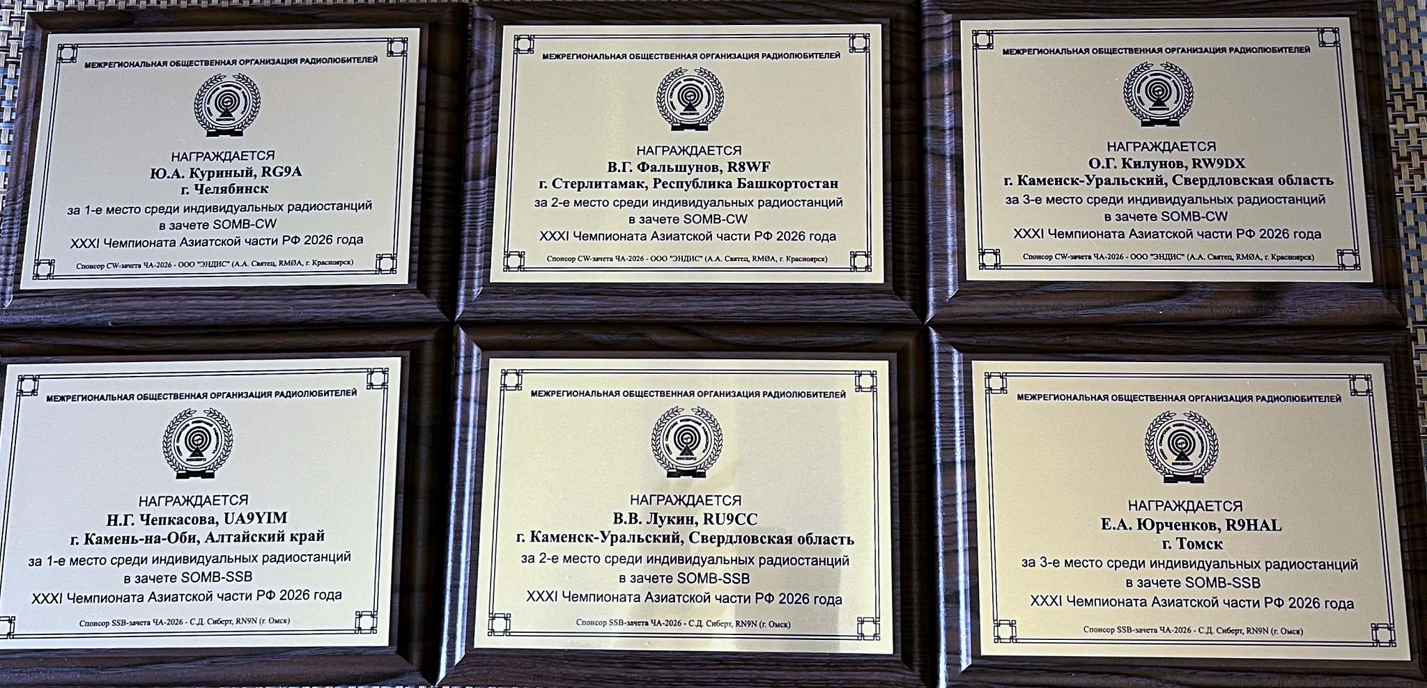 - Спонсорам CW и SSB зачетов ЧА-2026 – Компания ООО “ЭНДИС” – (А.А. Святец, RM0A, г. Красноярск) и C.Д. Сиберт RN9N (г. Омск) – награждение настенными наградами ССФ за 1-3 места в индивидуальных зачетах SOMB-CW и SOMB-SSB соответственно.