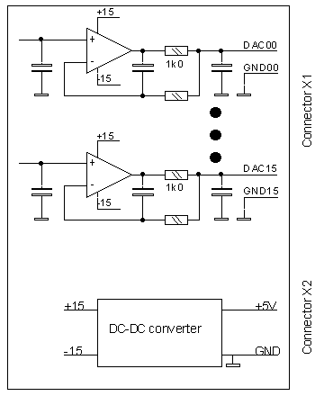 Устрой ство CANDAC16 представляет из себя 16-канальный 16-разрядный двухполярный цифроаналоговый преобразователь. Ниже приводится условная схема устройства, которая облегчит понимание правильности включения устройства.