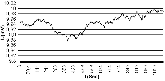 Из осциллограммы видно, что сигнал колеблется с секундными и минутными временами и амплитуда отклонений достигает сотен микровольт. Это укладывается в гарантированную точность устройства CDAC20, однако были проведены дополнительные расследования. При снятии приведенной осциллограммы, блок лежал на лабораторном столе в комнате по которой ходили люди, хлопала дверь, т.е. степень равновесия температурного поля была неизвестной. Для контроля шумы были измерены в замкнутом объеме после установления равновесного теплового режима.