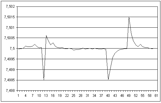 Устройство было переведено в режим цифровой коррекции при выходном напряжении ЦАПа 7,5 В. Поведение выходного сигнала устройства показано на следующей иллюстрации.