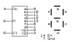 Исходное состояние схемы устанавливается подачей сигнала H на вход Cl (5). Входная частота подается на вход Ck (4), а выходная частота (в 6 раз меньше) появляется на выводе Y6 (2). После каждого второго входного импульса на выводе Y2 (3) формируется сигнал, который используется для выработки команды сброс в разрядах индикатора "Часы". В случаях использования жидкокристаллических индикаторов, в схеме предусмотрено получение на выходе прямого и инверсного кода (относительно входа Ck) путем подачи на вывод 6 (M) сигнала с частотой 32 или 64 Гц. При применении индикаторов, не требующих знакопеременного питающего напряжения, на вывод M подается постоянное напряжение L.
