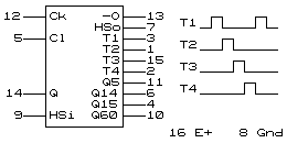 Q5 - выход делителя 2^5 (частота 1024 Гц) Q14 - выход делителя 2^14 (частота 2 Гц) Q15 - выход делителя 2^15 (частота 1 Гц) Q60 - выход делителя выход счетчика секунд HSo - выход сигнала звонка -O - инверсный выход генератора Cl - вход "установка 0" HSi - вход сигнала звонка Ck - вход генератора/делителя Q - вход управления скважностью мультиплексора (управление яркостью индикации) Микросхема