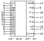 A0-A3, B0-B3 - входы операндов;F0-F3 - выход результата; S0-S3 - код функции; M- выбор операции арифметические/логические; Cn- вход переноса; Cn+4- выход переноса; A=B- выход компаратора; -P,-G - выходы для стыковки со схемой ускоренного переноса. Выход A=B - с открытым коллектором.