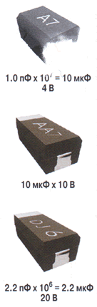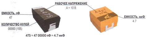 емкости, на второй строке — рабочее напряжение. Емкость может указываться