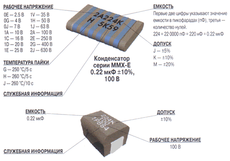 Причем буквы обозначают напряжение и емкость, а цифра указывает множитель.