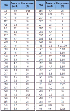 (буквы или цифры), обозначающие рабочее напряжение и номинальную емкость.