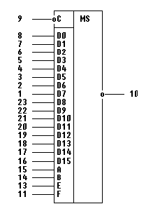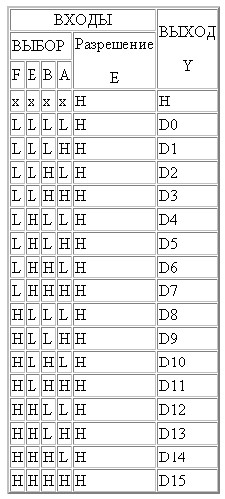 Микросхема представляет собой селектор-мультиплексор данных на 16 каналов со стробированием. Позволяет с помощью четырех адресных входов A-F передать данный поступающие на один из входов D0-D15 к выходу Y. Если на вход разрешения С подано напряжение высокого уровня, то на выходе Y также появится высокий уровень независимо от адреса остальных входов. Напряжение низкого уровня на входе Е разрешает прохождение данных от входов D0-D15. Корпус К155КП1 типа 239.24-1, масса не более 4 г. |