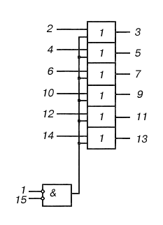Микросхема представляет собой шесть повторителей с раздельными элементами управления по входам (по двум и четырем повторителям) и тремя состояниями на выходе. Корпус К155ЛП11 типа 238.16-2, масса не более 1 г.