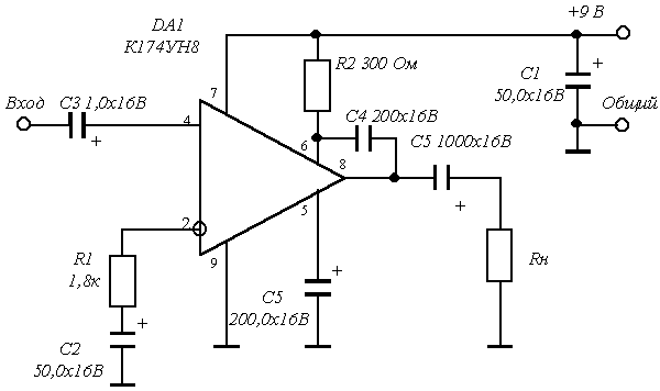Схема включения ИМС К174УН8 с замленной нагрузкой