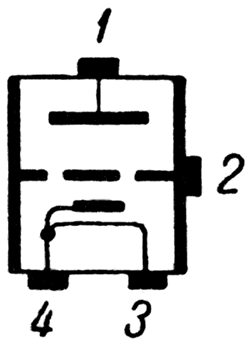 1 - анод, 2 - сетка, 3 - подогреватель, 4 - катод и подогреватель.