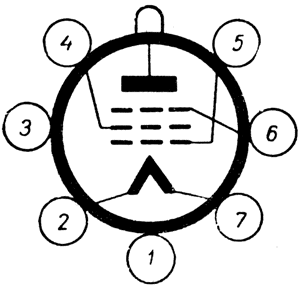 1 - гильза цоколя; 2 и 7 - нить накала (катод); 3 - свободный; 4 - вторая сетка; 5 - первая сетка; 6 - третья сетка. А - верхний колпачок на баллоне - анод.