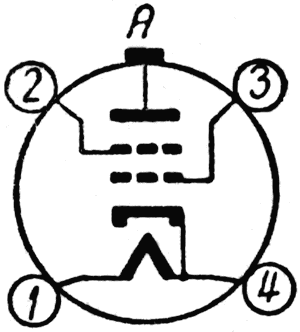 1 - подогреватель, 2 - сетка вторая, 3 - сетка первая, 4 - подогреватель и катод, А - анод.