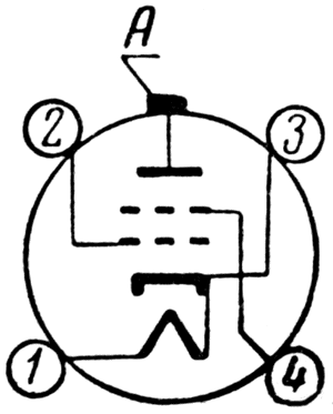 1 - подогреватель, 2 - сетка первая, 3 - катод и подогреватель, 4 - сетка вторая, А - верхний вывод анода.