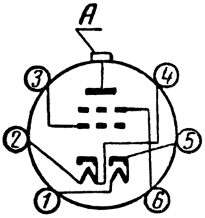 1 - подогреватель, 2 - подогреватель, 3 - сетка первая, 4 - катод и подогреватель, 5 - катод и подогреватель, 6 - сетка вторая, А - верхний вывод анода.