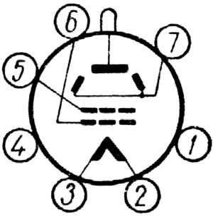 1 и 4 - свободные; 2 и 3 - катод (нить накала); 5 - вторая сетка; 7 - лучевые пластины. Верхний колпачок на баллоне - анод.