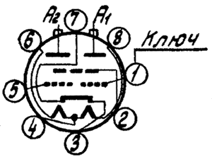 2 - анод второго тетрода; 1 - первая сетка первого тетрода; 2 - вторая сетка; 3 и 7 - катод; 4 - подогреватель (средняя точка); 5 - первая сетка второго тетрода; 6 и 8 - подогреватель.