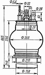 стабилизаторах напряжения. Оформление — металлостеклянное. Охлаждение — принудительное: анода — водяное, ножки и баллона — масляное. Масса 16 кг. |