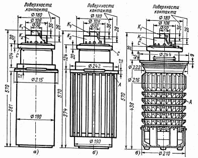 сеткой и с общим катодом. Оформление - металлокерамическое, с кольцевыми выводами катода и сетки. Охлаждение - принудительное: ГК-10А: анода - водяное 120 л/мин; ножки и изолятора анода - воздушное 200 м3/ч; ГК-10Б: анода - воздушное 5200 м3/ч; ГК-10П: анода - испарительное. Масса ГК-10А 22 кг, ГК-10Б 42 кг, ГК-10П 36 кг. |