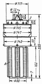 схемах с общей сеткой. Оформление - металлостеклянное. Рабочее положение - вертикальное, стеклянным баллоном вверх. Охлаждение - принудительное, воздушное: анода - не менее 800 м3/ч; ножки - не менее 60 м3/ч; баллона - не более 90 м3/ч. Масса 5,5 кг |
